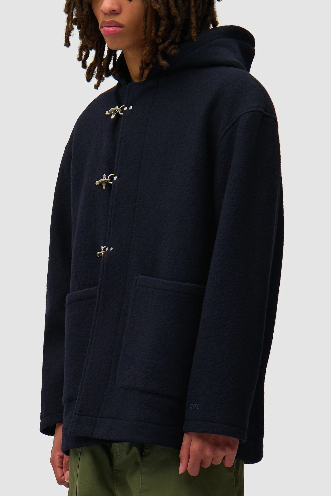 Le Duffel Coat est fabriqué dans un tissu de laine épais de couleur marine et comporte une fermeture à loquet de pompier sur le dessus. Doté de deux grandes poches frontales et d'une capuche pour plus de commodité et de praticité, il est parfait pour toutes les occasions en plein air.