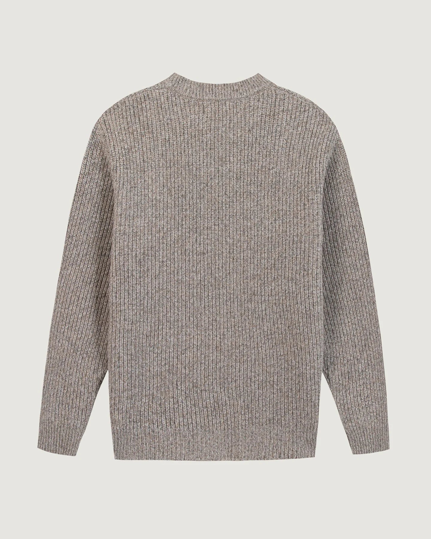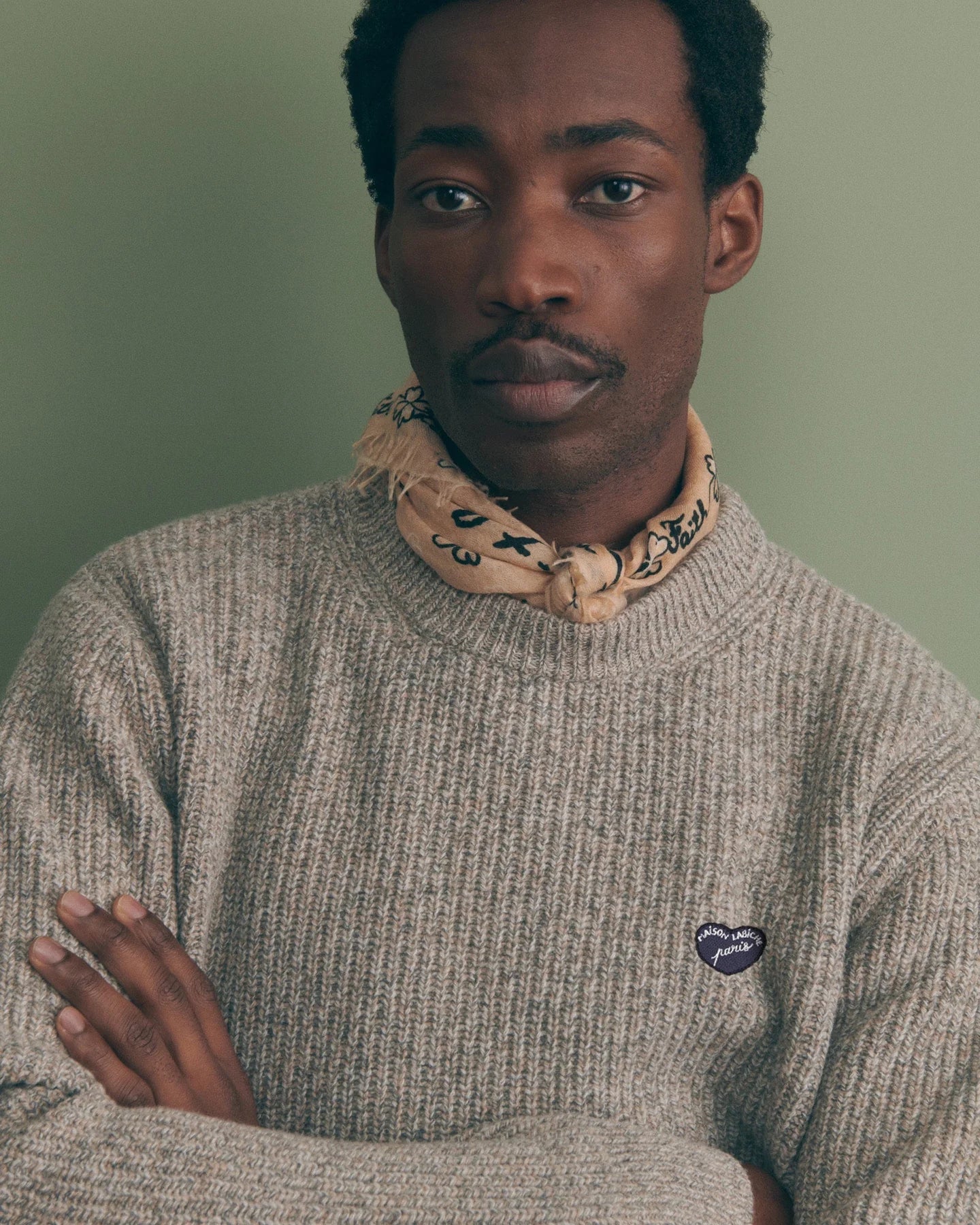 Notre pull Mulot a une coupe confortable, un bas de manches, de corps et encolure en bord-cote. Son patch est notre signature.
