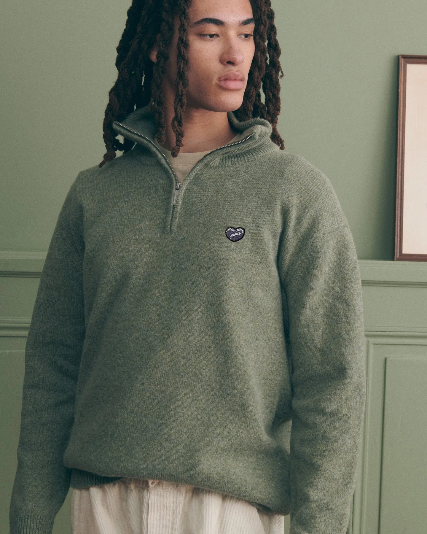 Notre pull Delépine en laine d'agneau douce et moelleuse a une coupe confortable, un col camionneur zippé ainsi que le bas des manches et du corps en bord-côte. Son patch est notre signature.