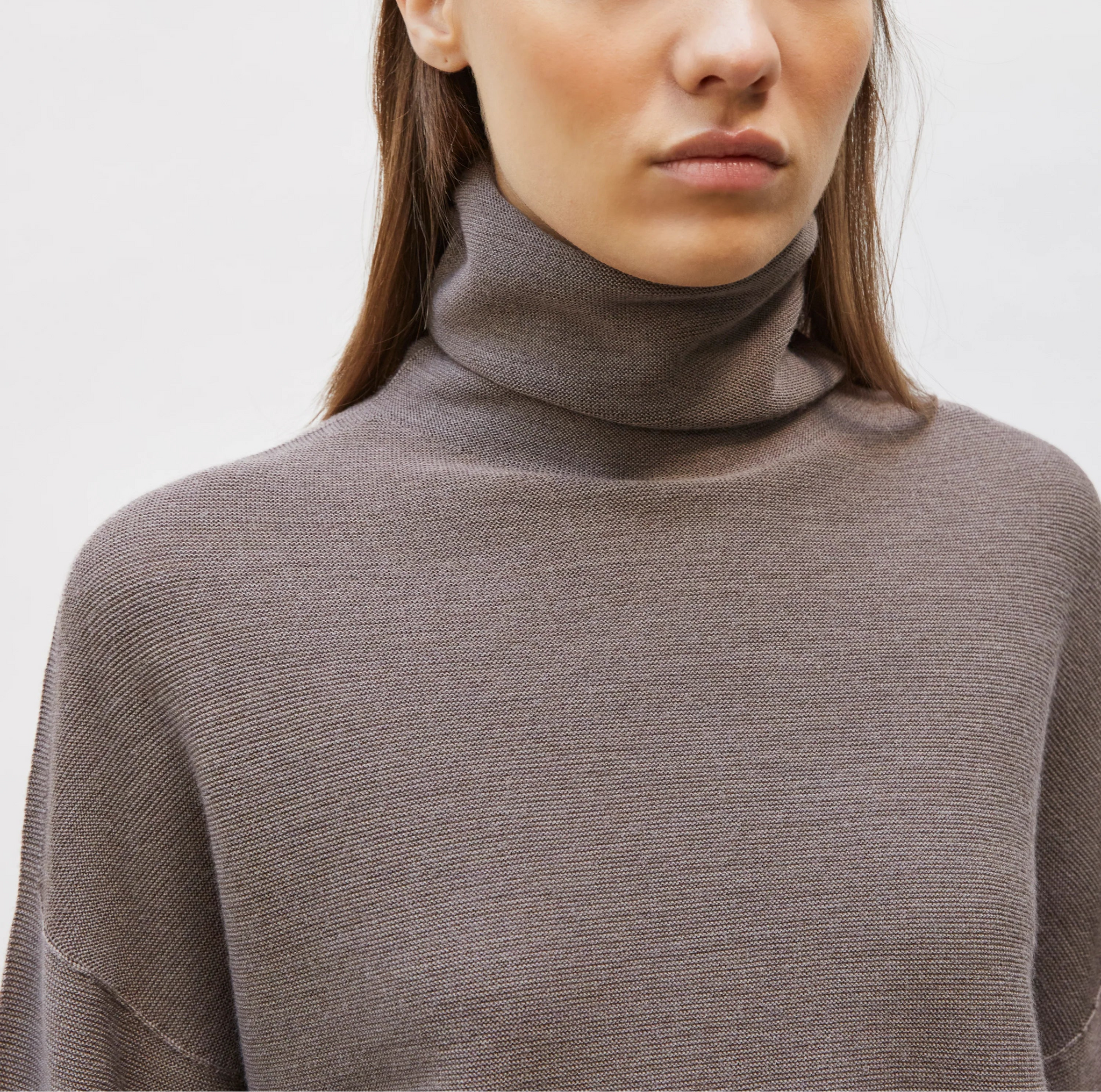 ce top col montant oversize est tricoté sans coutures en Italie pour un confort maximal. sa coupe loose et son poignet haut délicatement fendu lui donnent une allure moderne, tandis que son col à laisser plisser sur le cou apporte une touche féminine. fabriqué dans l'iconique point mousse molli, ce top en maille fine pour femme vous garantit une belle tenue tout en gardant un tombé moelleux.