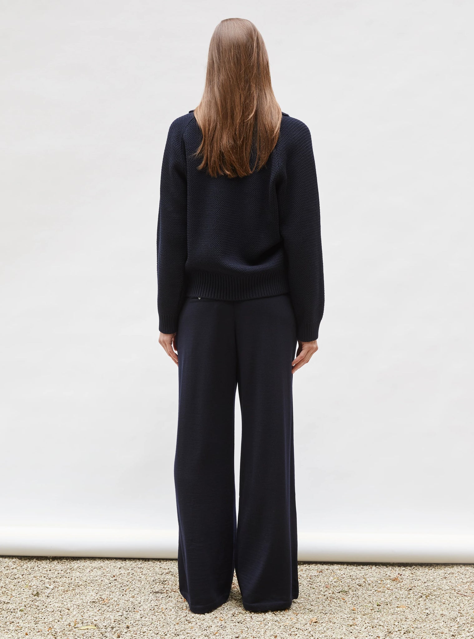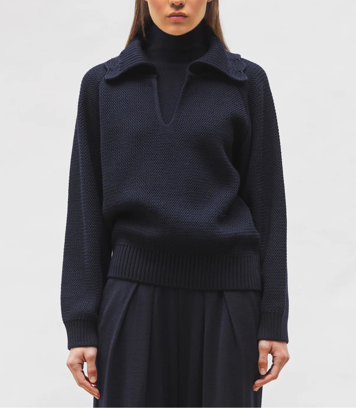fabriquée en Italie, cette version revisitée de l'iconique "vareuse" est tricotée dans une laine douce et extrafine, luxueuse et moelleuse. ce pull en maille fine pour femme adopte une coupe généreuse avec un large col en côte réhaussé d'une finition en point ajourés, pour un mélange parfait de confort et d'élégance.