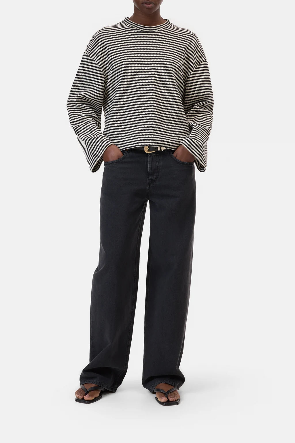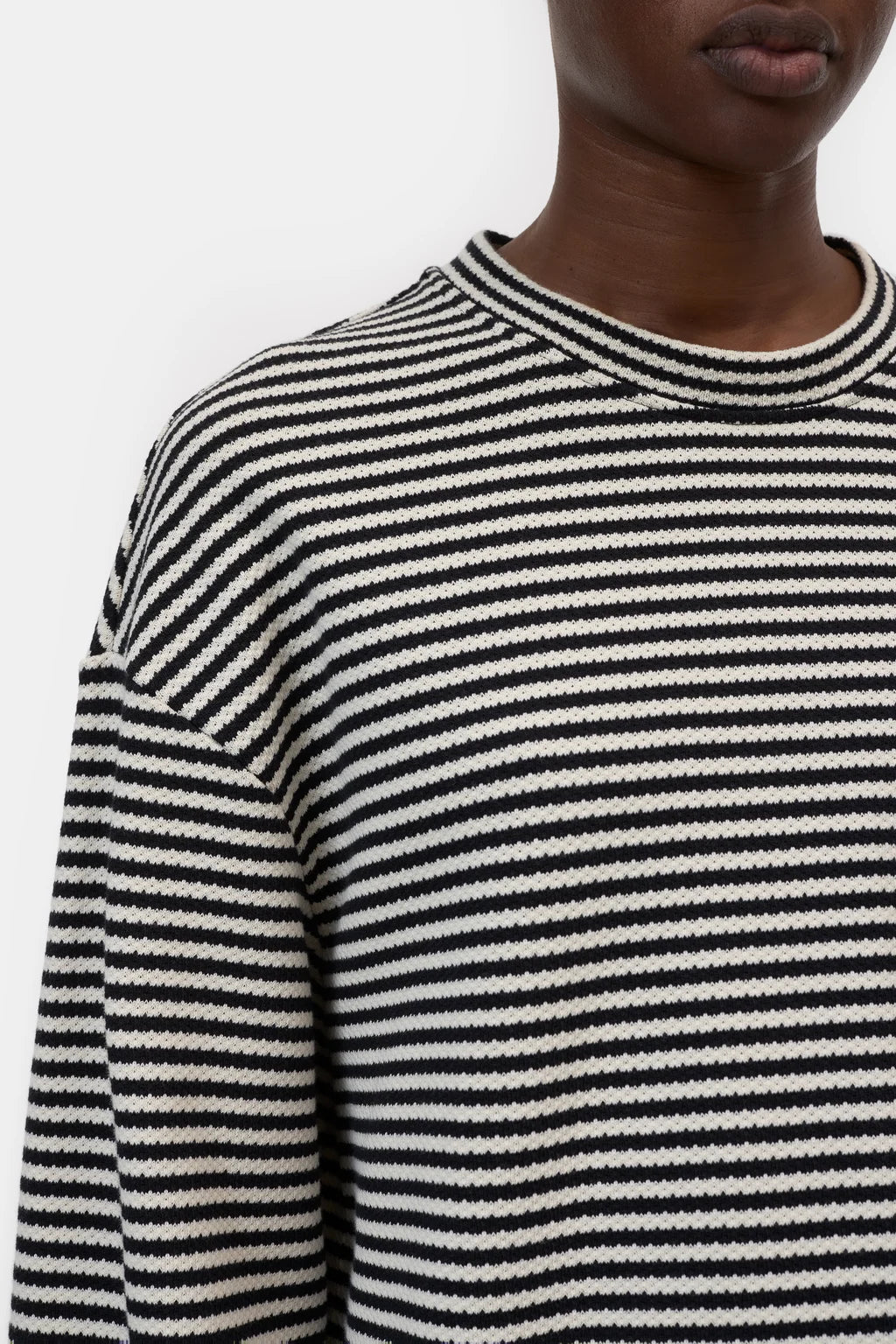 Notre t-shirt à manches longues rayé et coupe décontractée est confectionné en jersey de coton côtelé. Il présente des coutures d'épaules décalées, des manches légèrement plus larges, un col rond et un ourlet droit. Étiquette monogramme Closed sur la couture latérale. Made in Portugal.