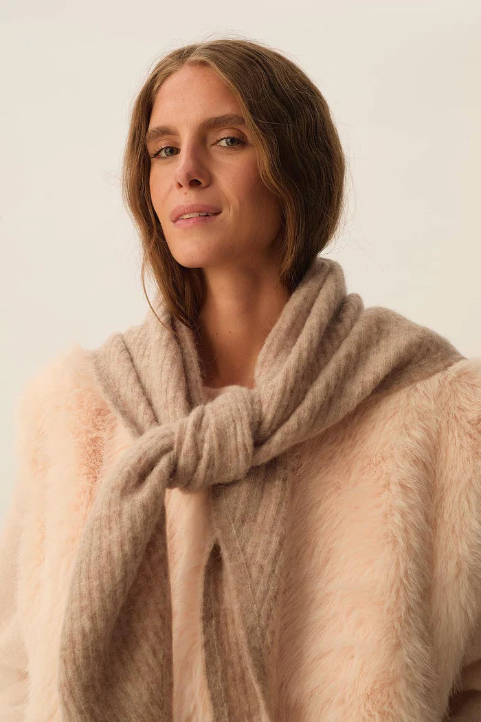 Spécialement créée pour nos 25 ans, l’écharpe Aubelle prend la forme d'un foulard d'hiver en laine mérinos et alpaga. Minimaliste et versatile, portée comme un châle ou pointe devant façon bandana, elle signera tous vos looks.