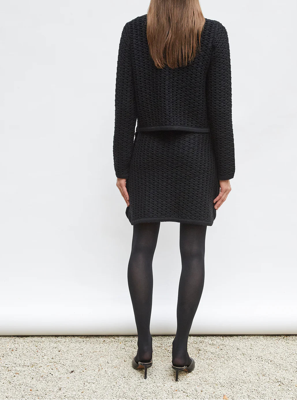 tricotée en Italie dans une pure laine extra-douce, cette veste de luxe pour femme molli se caractérise par sa maille tweedée d'une grande élégance. avec sa coupe ajustée et assez courte aux détails arrondis, elle est moderne et confortable. ses fausses poches et sa ganse lui offrent des finitions délicates, tandis que son petit bouton au col lui apporte une jolie structure.