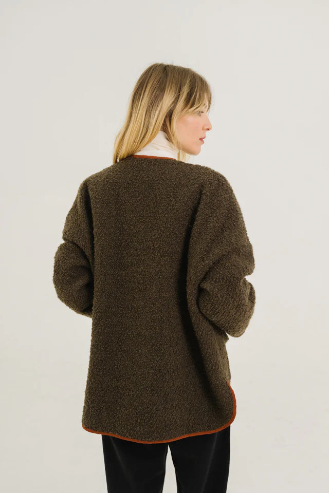 Veste mi-longue, en laine bouclette couleur marron clair, doublée devant et dos, emmanchure basse, deux poche plaquée devant. Boutons apparent, coupe oversize, sans col. Tissée en italie. Biais contrastant.