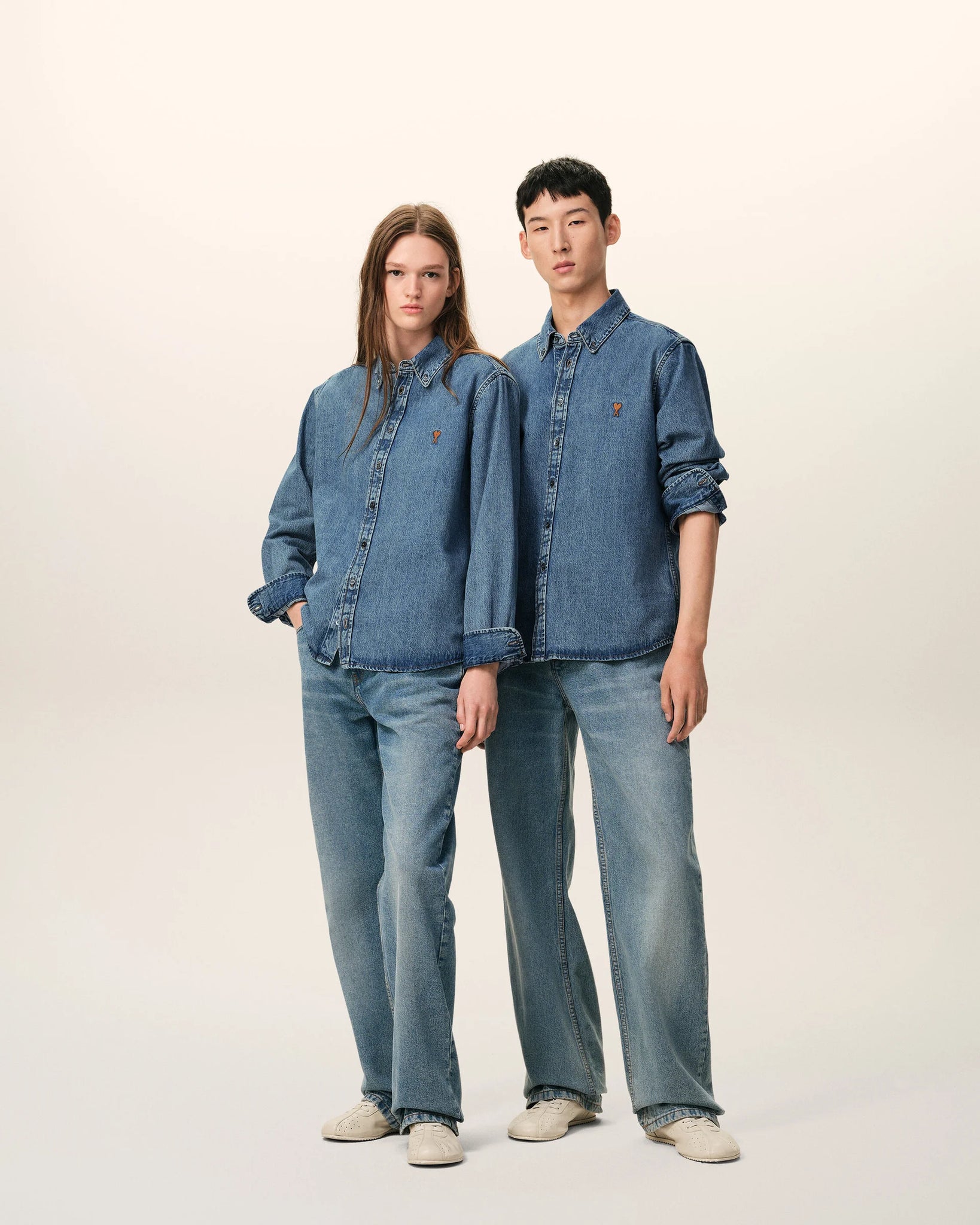 Chemise à col boutonné Ami de Coeur en denim indigo délavé léger.