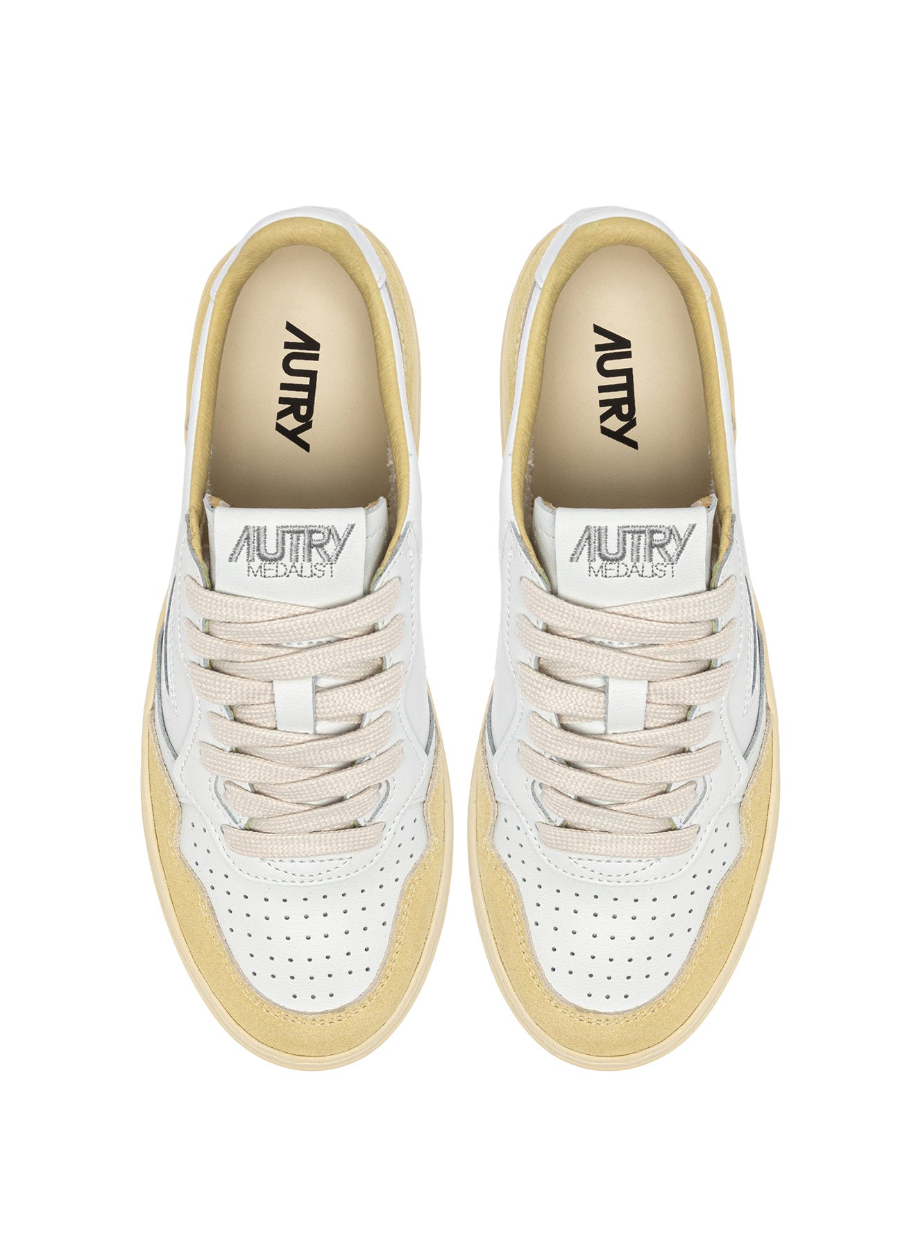 La Medalist d'Autry inaugure une nouvelle ère de style et de confort. Avec son profil bas à la cheville, cette basket pour homme est confectionnée en cuir de chèvre blanc et présente des empiècements en daim gris avec un talon logé blanc qui définit l'empeigne.