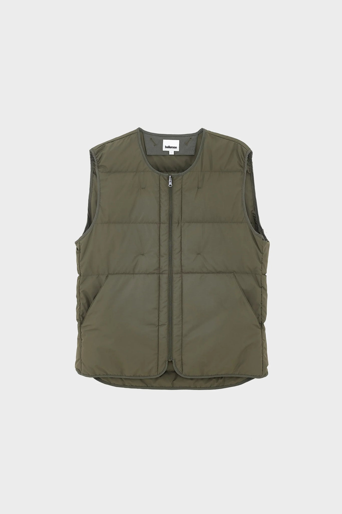 Veste sans manches classique à col rond et fermeture zippée sur le devant en tissu matelassé vert olive.