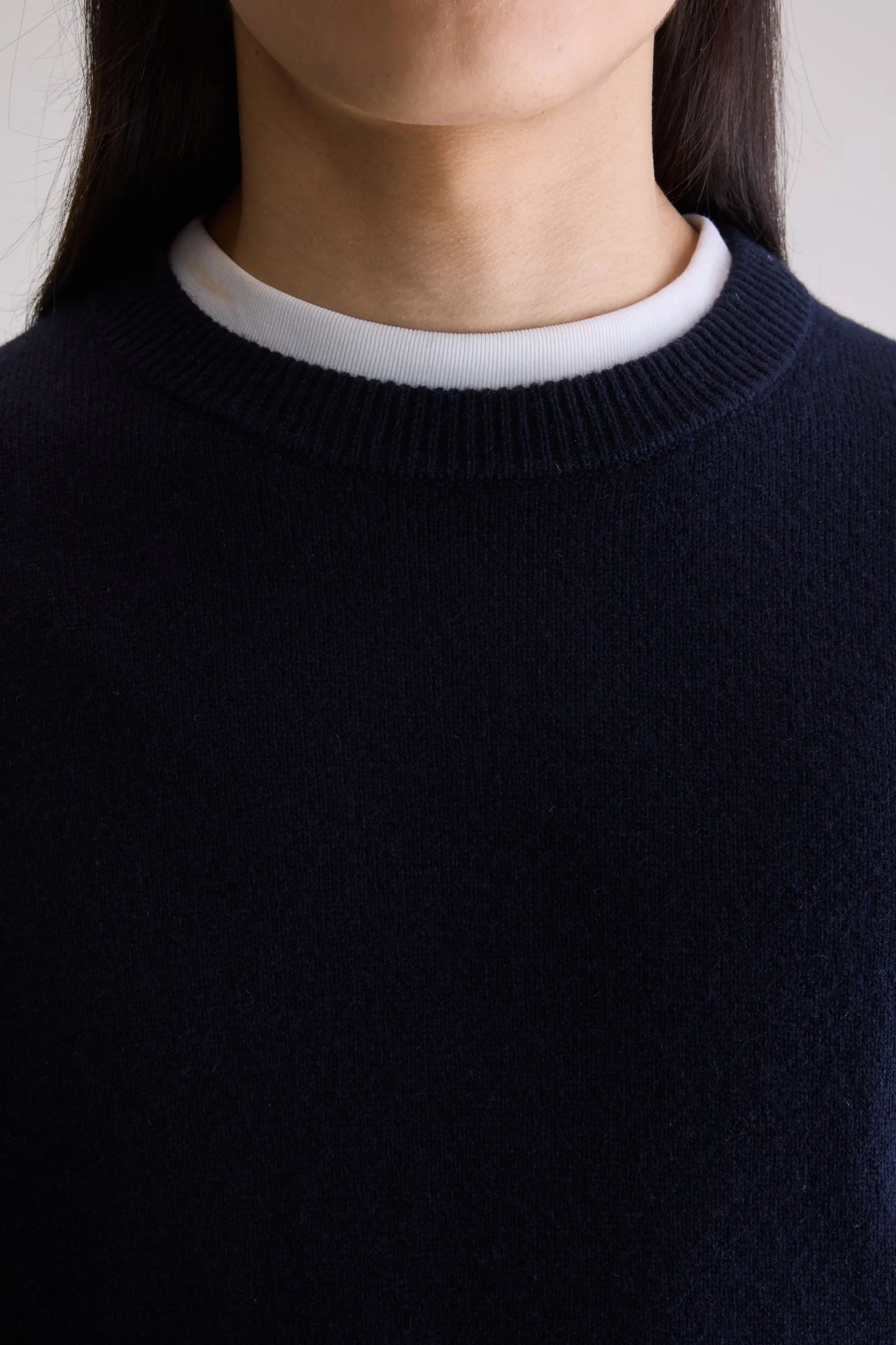 Pull classique à col rond en laine mérinos bleu marine.