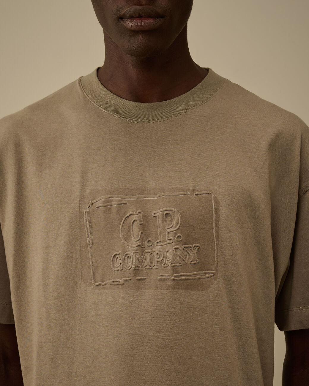 T-shirt à manches courtes confectionné en jersey 30/1, un tissu de coton léger au toucher doux et respirant. Ce t-shirt présente un col ras du cou côtelé et un logo gaufré sur la poitrine. L'impression en relief est appliquée à l'envers, en utilisant un film au dos du tissu pour maintenir la forme en relief. Habituellement utilisée sur le revers, l'impression a été intentionnellement placée sur le devant pour mettre en valeur l'aspect plus sombre et plus texturé. Coupe confortable.