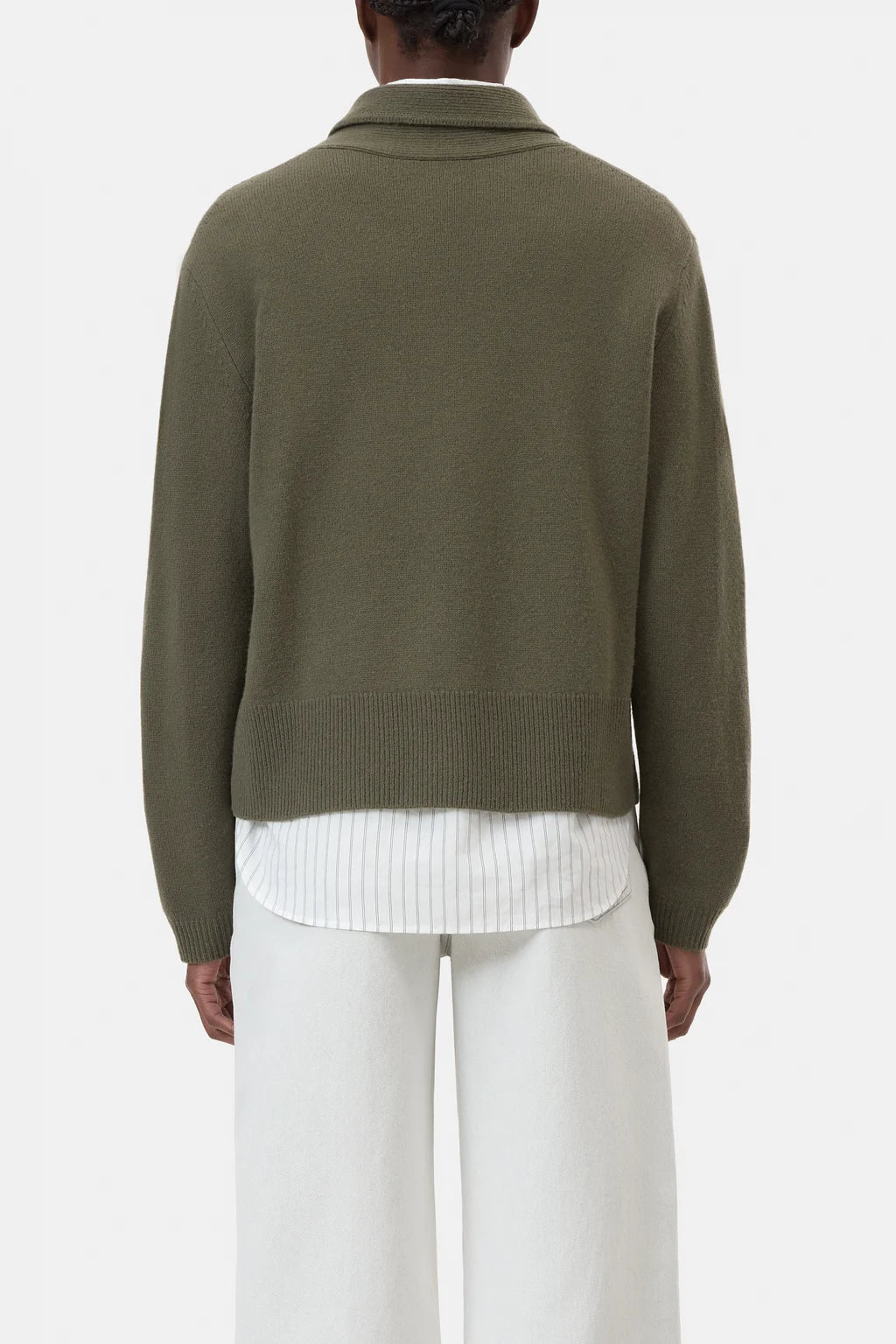 Notre top manches longues coupe régulière est en mérinos extra-fin avec un léger overwash pour une texture moderne. Le détail clé : un foulard-nœud tricoté au col.
