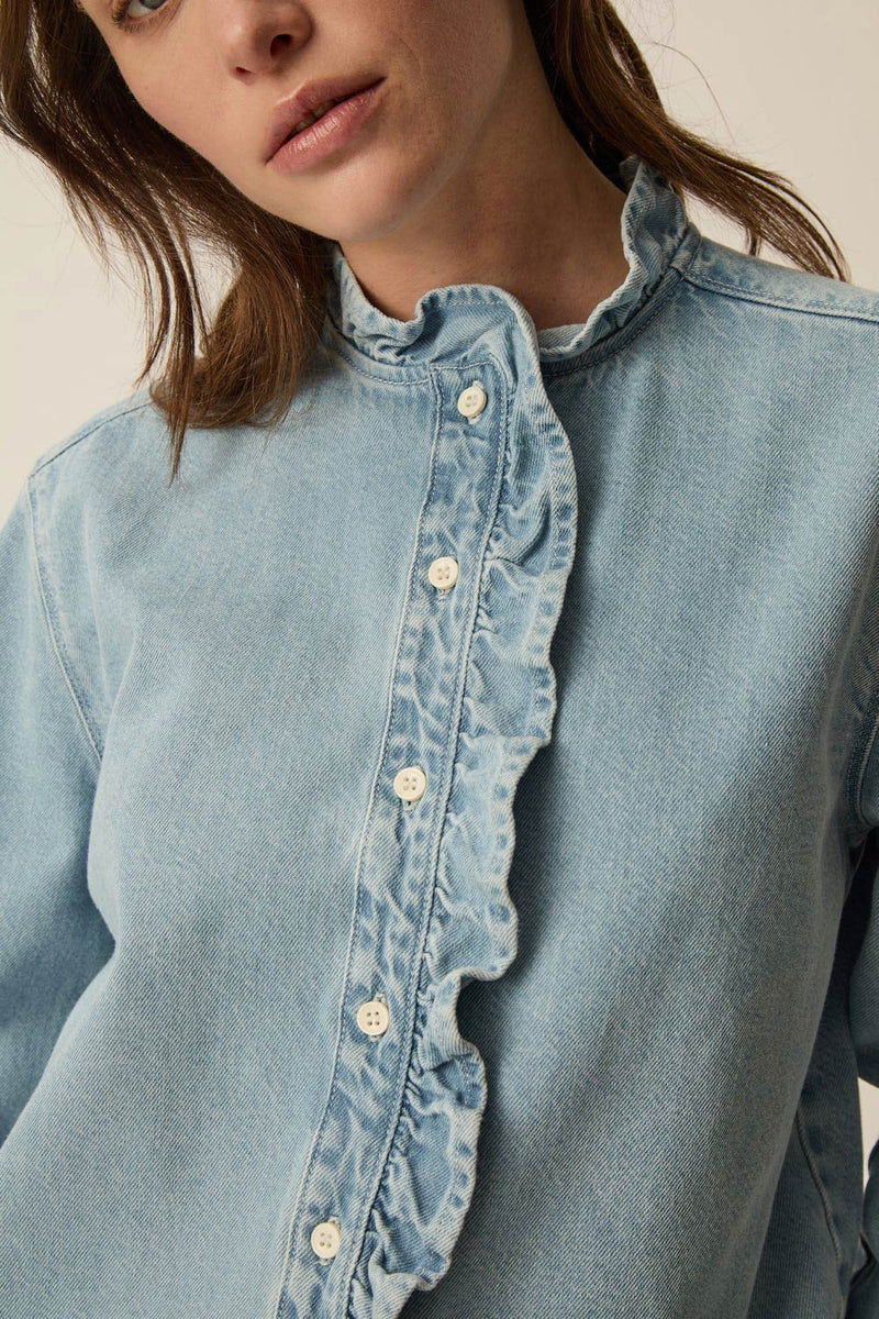 La chemise en jean gagne en sophistication avec le modèle Lassa. Déclinée en denim délavé, sa coupe droite est sublimée d'un détail volanté pour casser l’esprit utilitaire. Un modèle féminin pensé pour traverser les saisons à porter toute l'année seule ou sous un gilet sans manches.