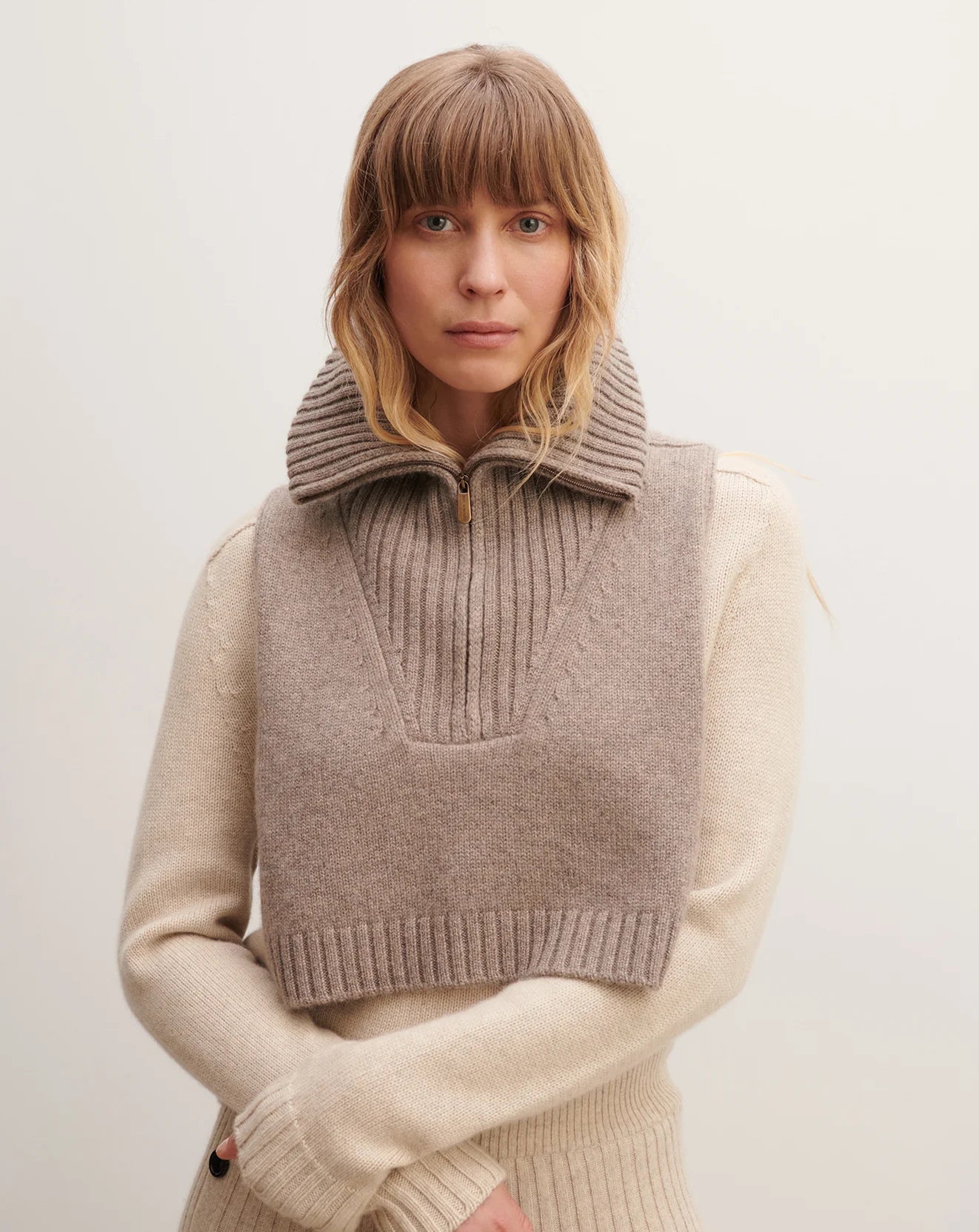 Plastron à col montant zippé et finitions côtelées. Modèle unisexe, réalisé en pur cachemire.