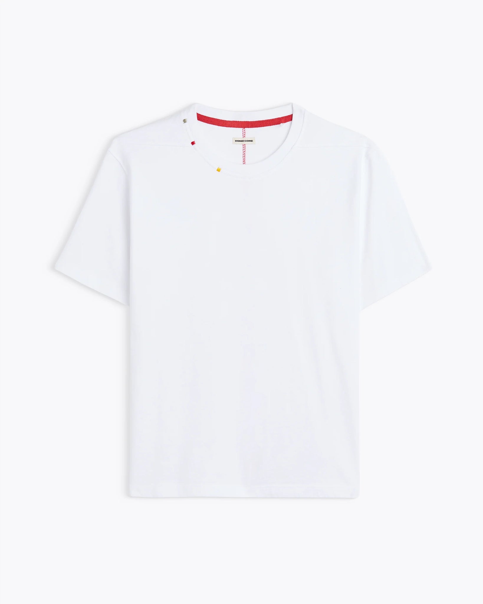Le Blake se décline en blanc, un t-shirt à manches courtes au design minimaliste. Avec sa coupe oversize et son détail décoratif au col, il offre un style moderne et décontracté. Dans le dos, une couture rouge verticale signature et une définition HOMECORE imprimée ajoutent une touche identitaire forte.