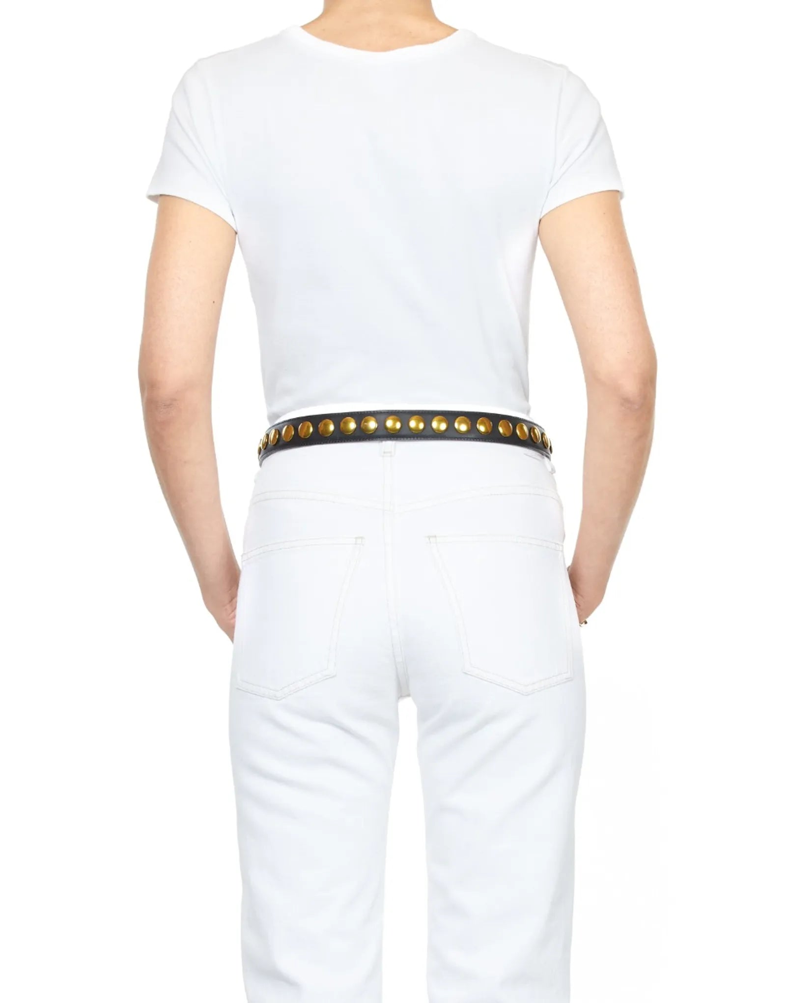 Ornée de larges rivets métalliques bombés. Ceinture réglable. Porté hanche ou taille haute.