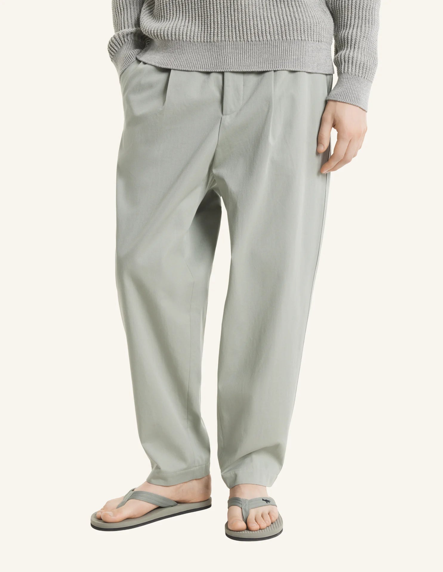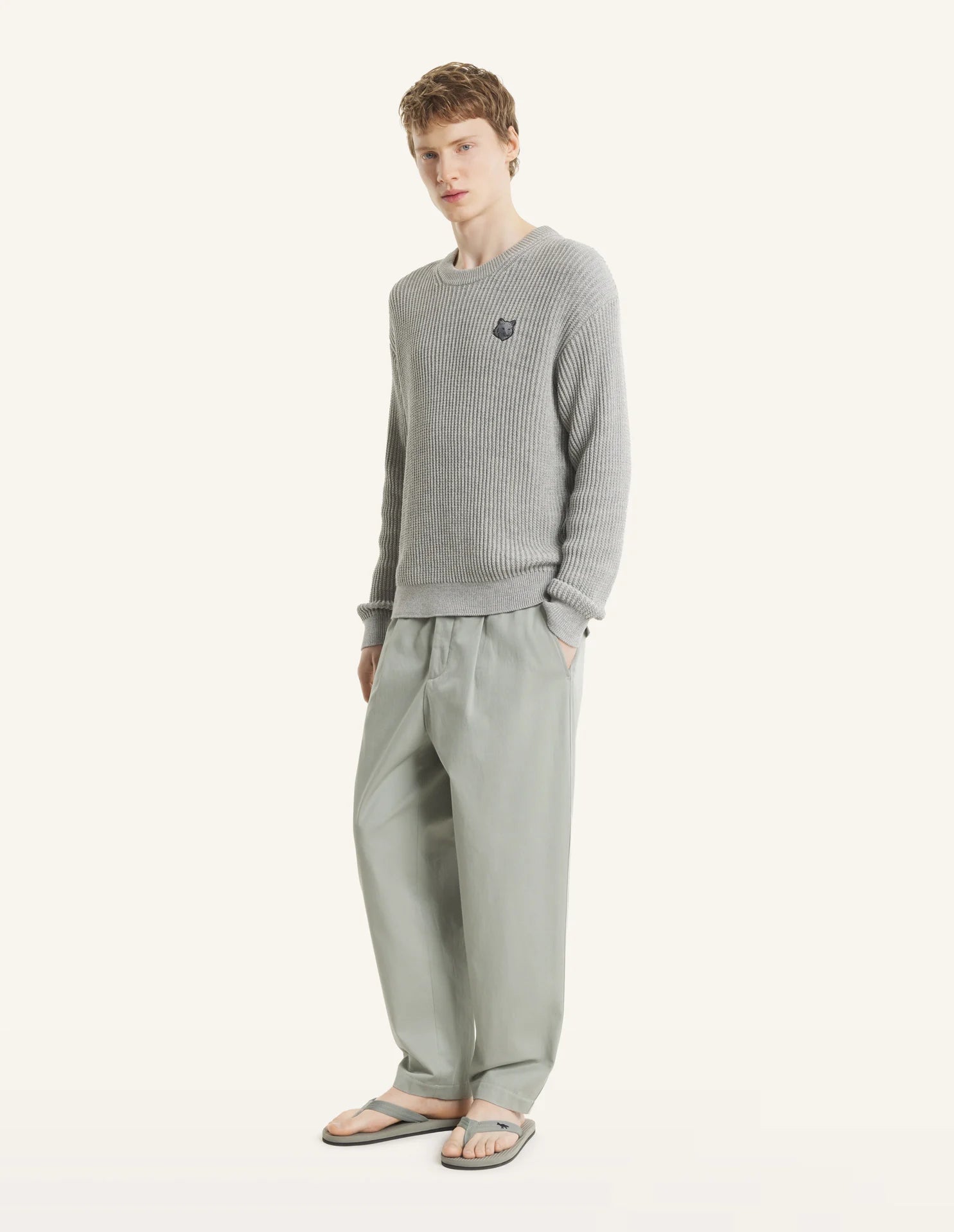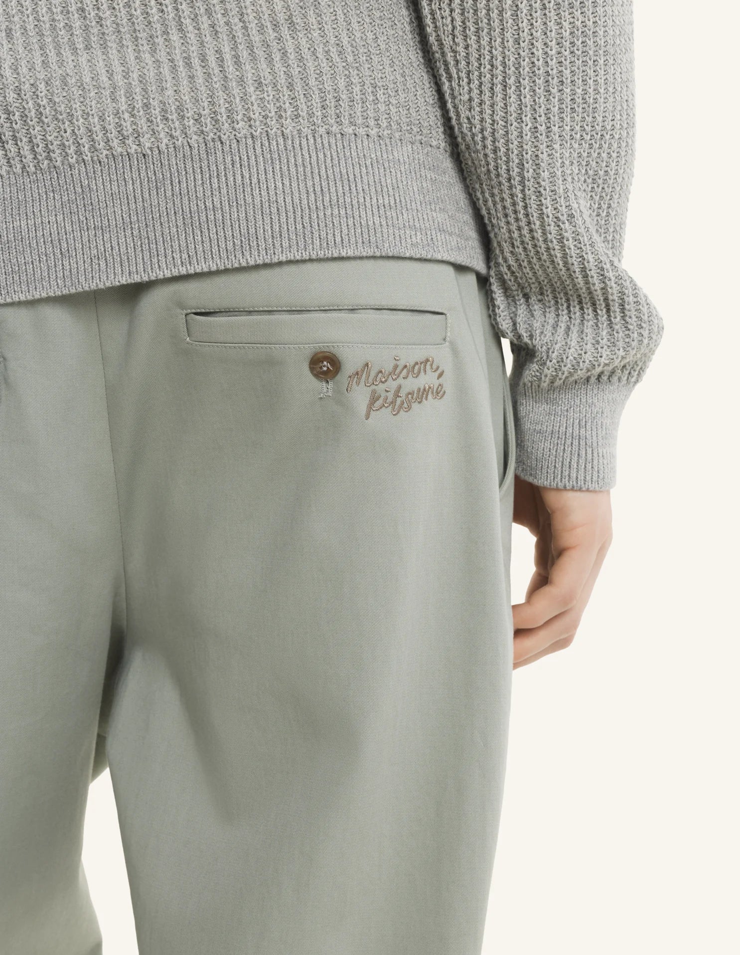 •Pantalon à pinces en toile légère délavée•Coupe décontractée•Simple pince sur le devant•Taille élastiquée avec passants•Fermeture boutonnée et braguette zippée cachée•Poches italiennes à lavant•Poche arrière droite passepoilée boutonnée et poche arrière gauche à rabat boutonné•Broderie Maison Kitsuné Handwriting à larrière