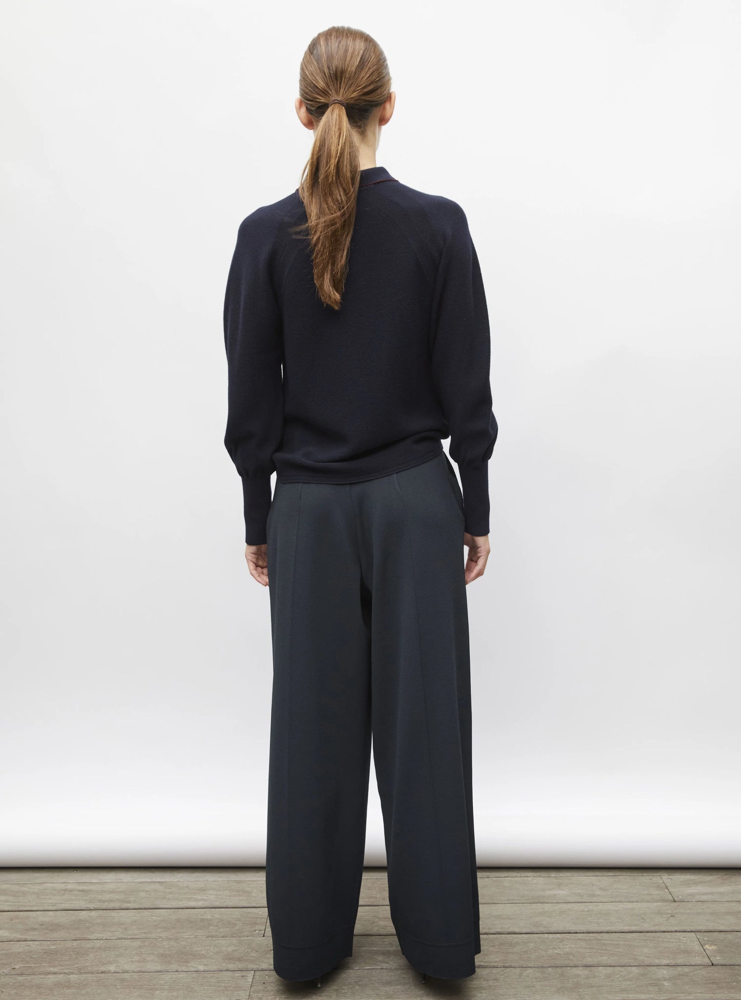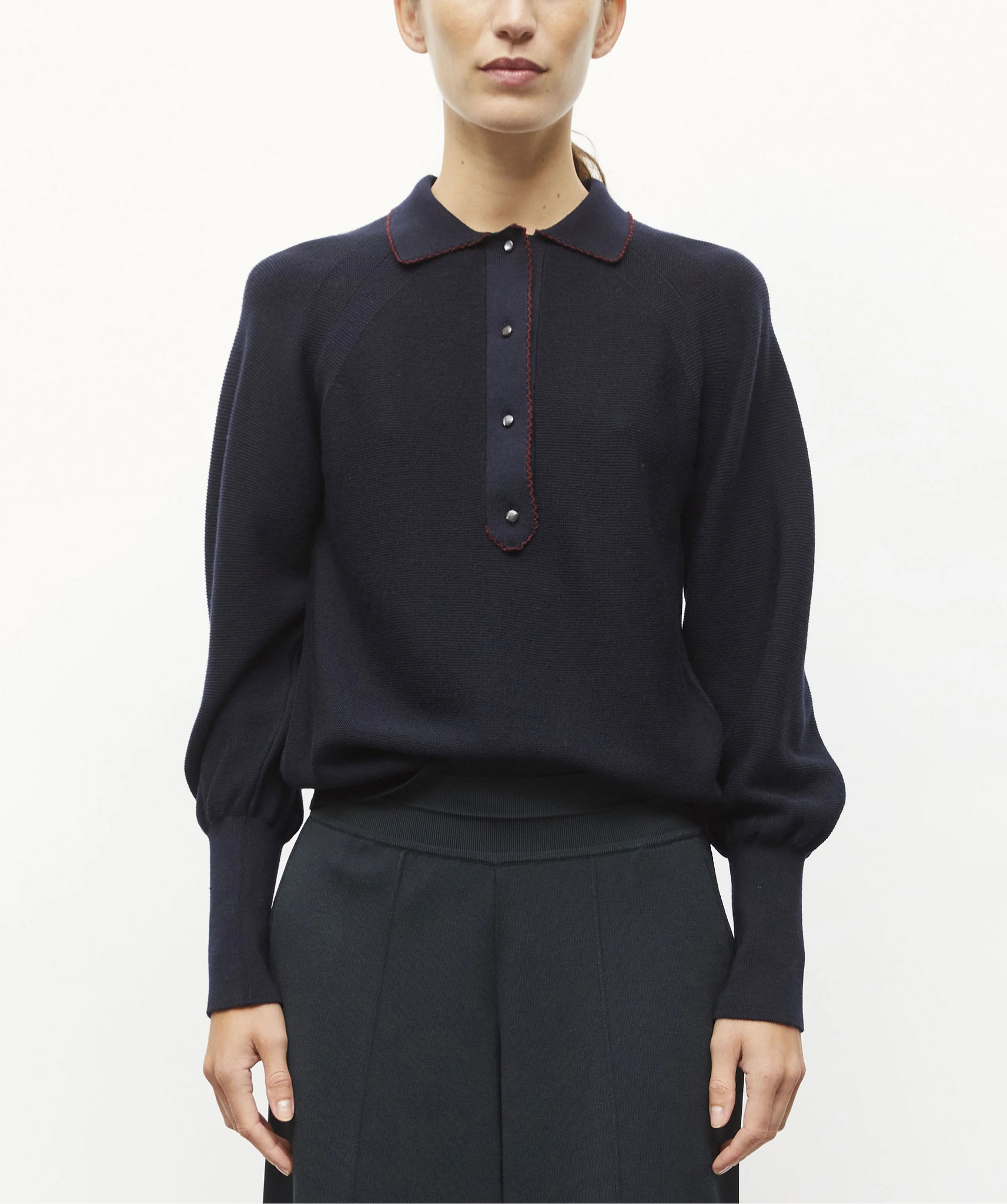 avec son col polo à finition picot et sa coupe droite, ce top molli en maille point mousse est tricoté en Italie dans une pure laine vierge extra-douce. confortable et féminin, il est doté d'un haut poignet en côte qui lui offre un joli blousé. son emmanchure raglan soulignée par le tricotage et sa patte de boutonnage ornée de boutons nacrés lui apportent des finitions élégantes.