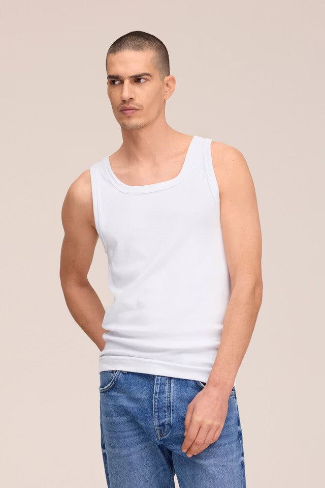 Débardeur en mélange de coton biologique légèrement extensible. Confectionné en côtes 2x2 avec des finitions en jersey simple à l'encolure et aux emmanchures.