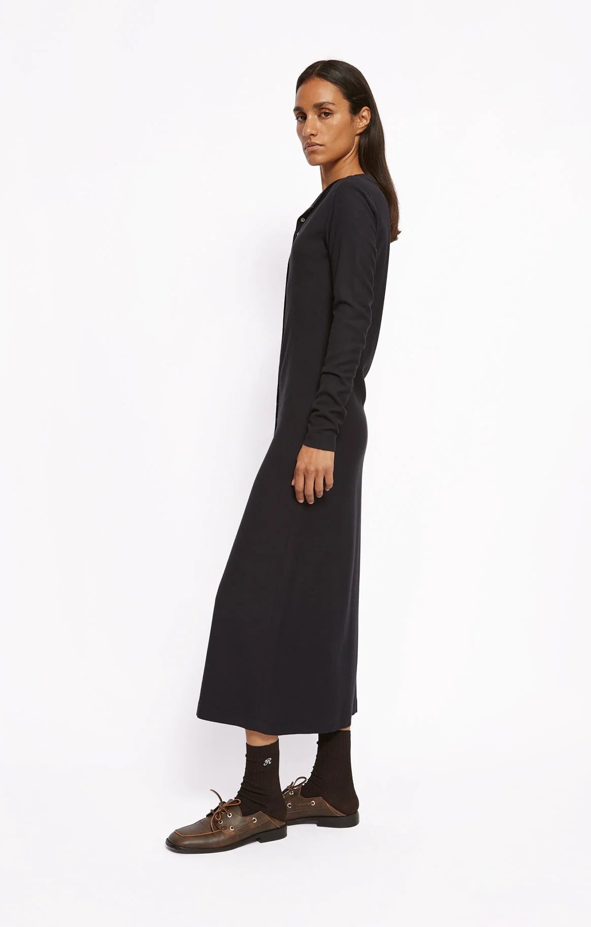 Robe à manches longues, avec une coupe ajustée et une longueur cheville, fermée par des boutons-pression en métal argenté.