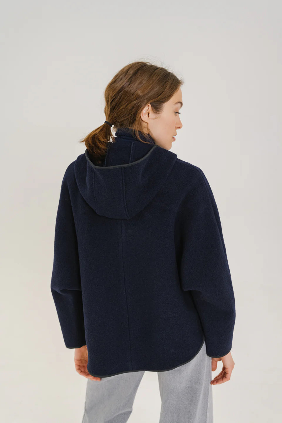 Veste ample esprit cape navy, laine bouillie, non doublé, manches chauve-souris, poches passepoilées, capuche. Biais et pate de boutonnage en nylon satiné anthracite.