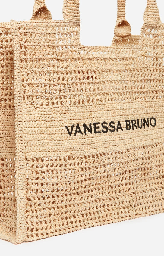 Panier en raphia crocheté au design ajouré, alliant légèreté et résistance, décliné en grand format pour accompagner le quotidien avec une allure naturelle. La signature “Vanessa Bruno” brodée signe cet accessoire artisanal, dont chaque pièce est unique.